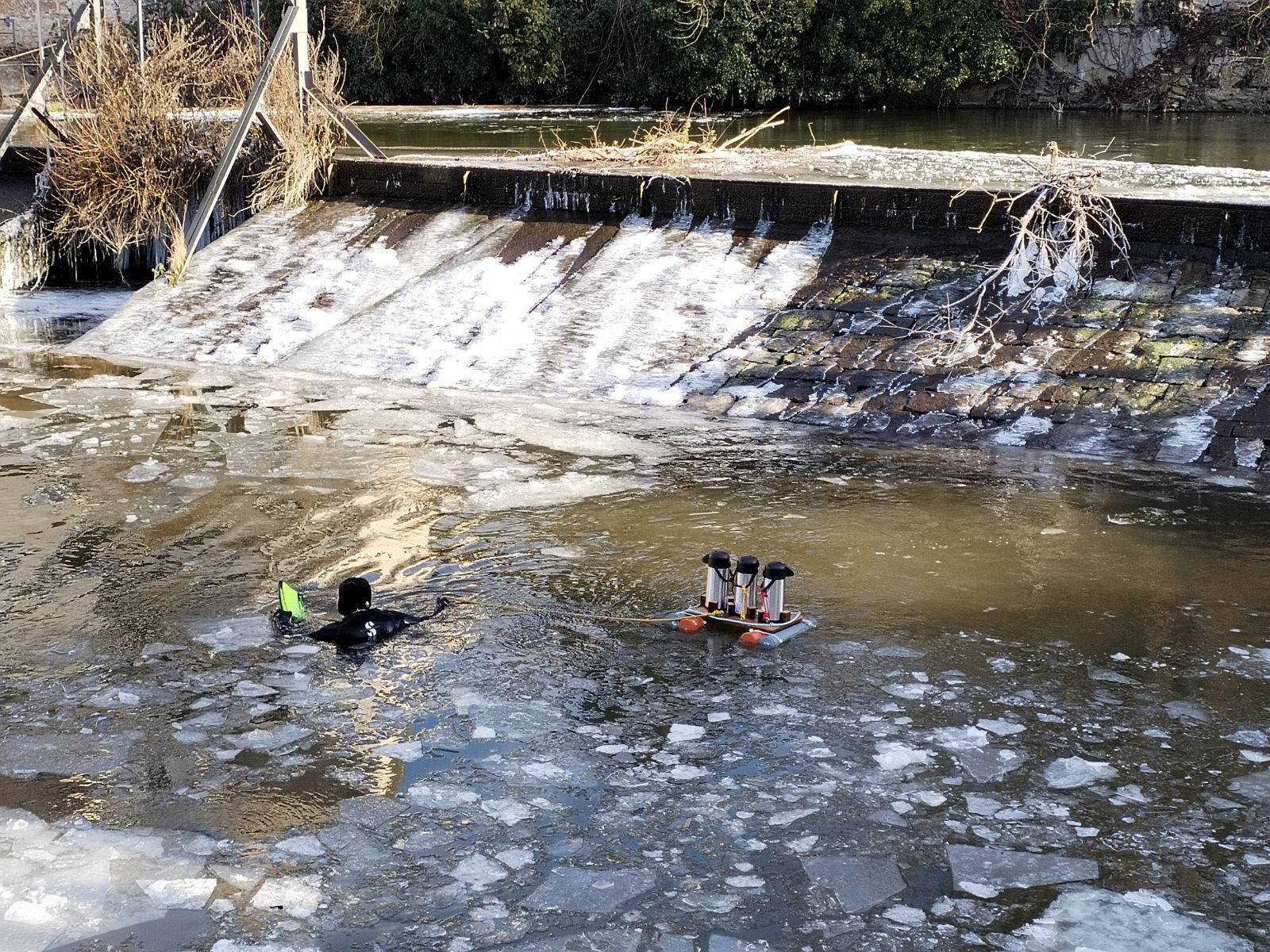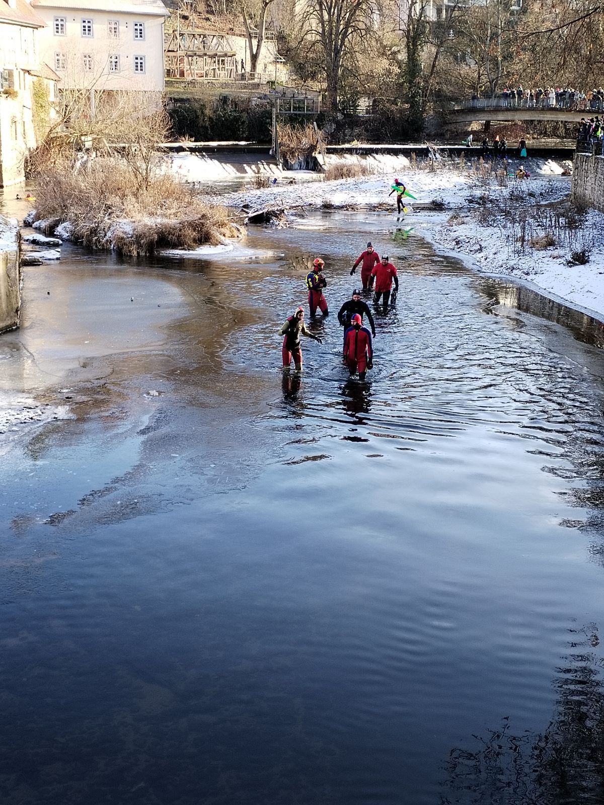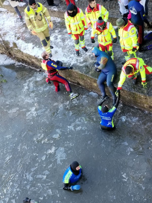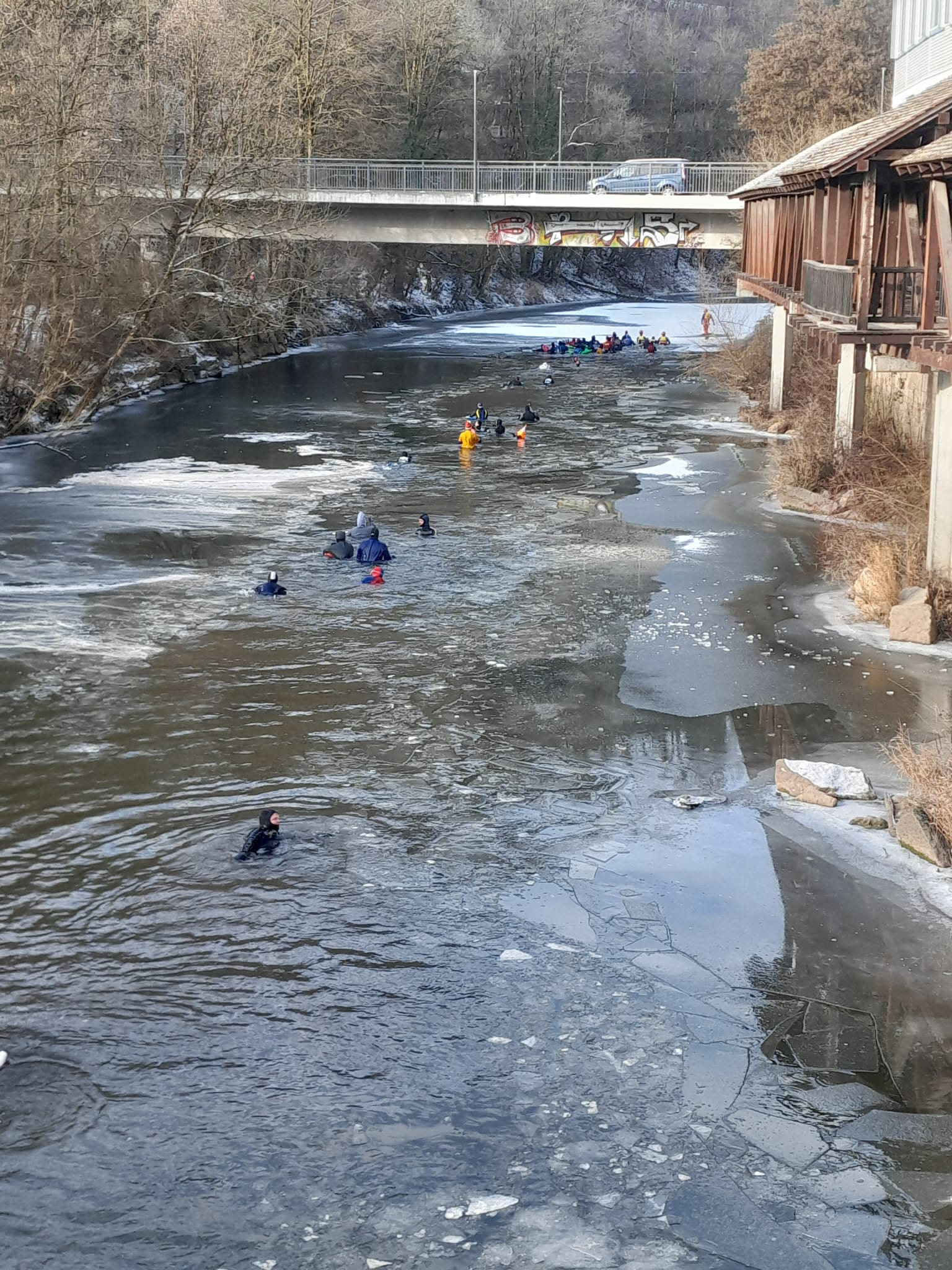 Sehr erfahrene Taucher haben sich bei ca -4°C Außentemperatur und bei Plus 2°C Wassertemperatur in zugefrorenen Kocher begeben.